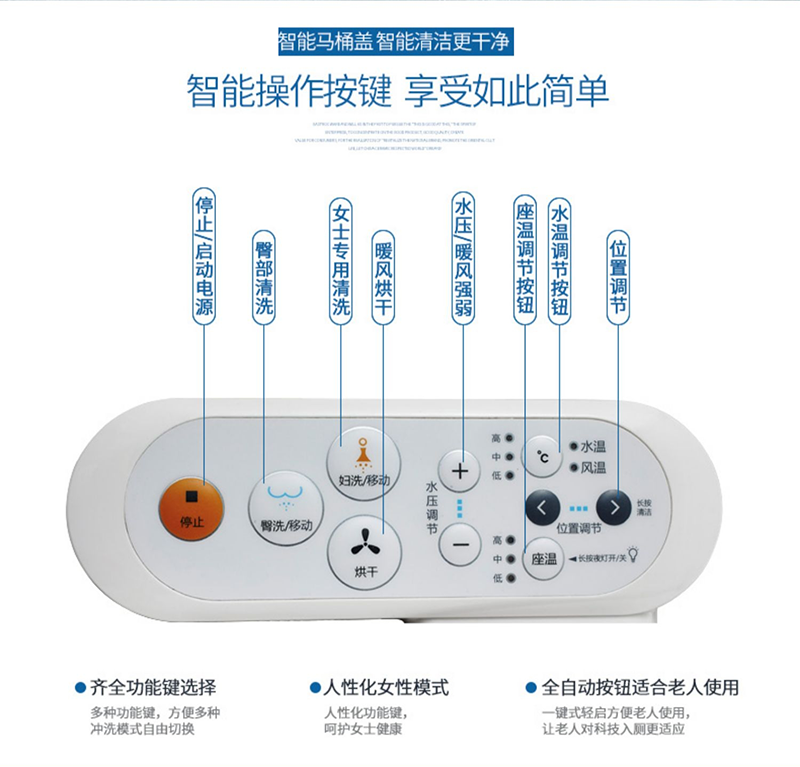 11、溫度調(diào)節(jié):可根據(jù)使用者個(gè)人喜好,調(diào)節(jié)水溫、座溫和風(fēng)溫;